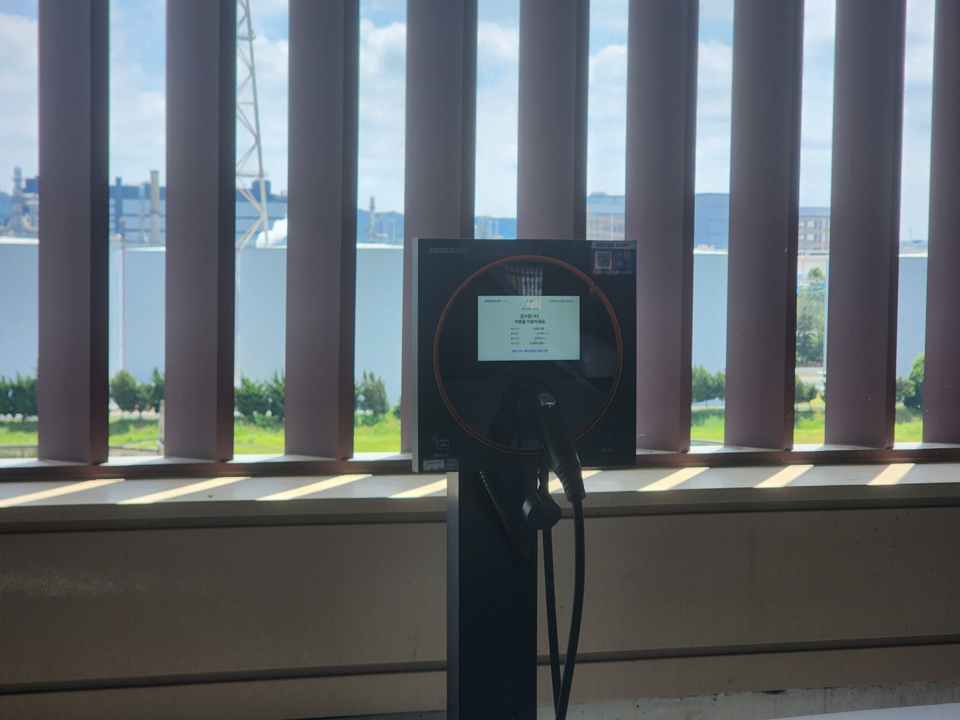 실제 현장은 5층 야외 주차 층에 자리하고 있어 자연광이 풍부하고, 수직 루버(Louver) 사이로 녹지가 시원하게 보입니다. 이러한 개방감 덕분에 충전 대기 시간 동안에도 답답함이 덜합니다.